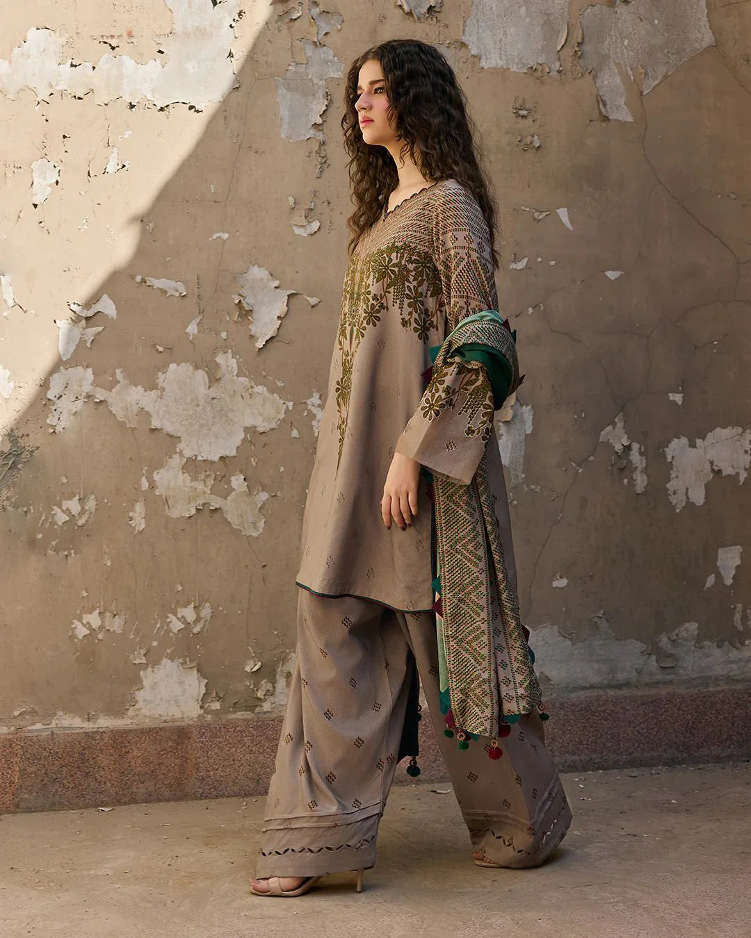Upgrade your wardrobe with this elegant 3-piece khadar suit designed for a sophisticated and graceful look. The shirt is made from premium quality khadar fabric, featuring a beautiful olive floral print on a soft beige base that enhances its luxurious appearance.